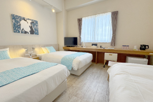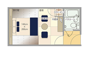 面積:17㎡ / 客室数:禁煙タイプ2室 / 客室階:2階 / 眺望:シティービュー / 定員:最大3名(3名利用時は1セット敷布団使用) ※お子様の添い寝は、大人1名(1ベッド)に対して1名までとなります。 / ベッドサイズ:マットレスタイプW140cm×1セット(敷布団タイプW100cm)
