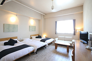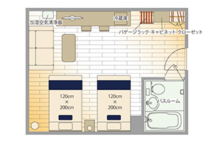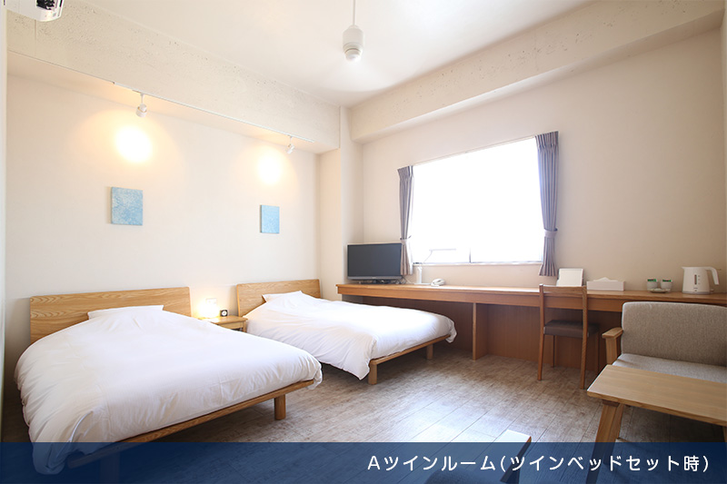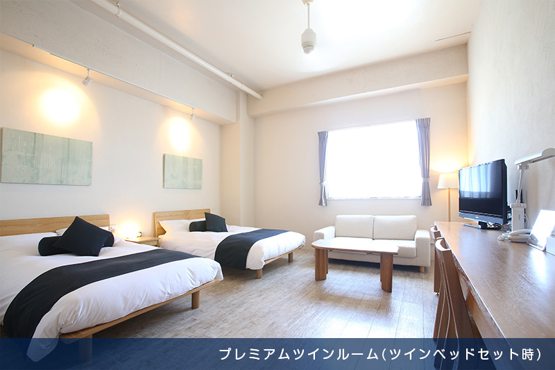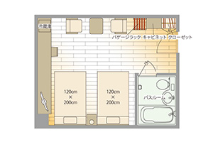 面積:22㎡、19㎡ / 客室数:禁煙タイプ2室 / 客室階:5階(最上階) / 眺望:シティービュー / 定員:22㎡タイプ最大3名(3名利用時は1台ソファーベッド)、19㎡タイプ最大2名 ※お子様の添い寝は、大人1名(1ベッド)に対して1名までとなります。 / ベッドサイズ:W120cm×2台(ソファーベッドW100cm)
