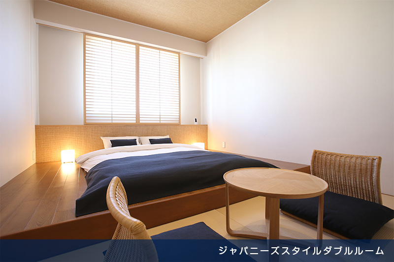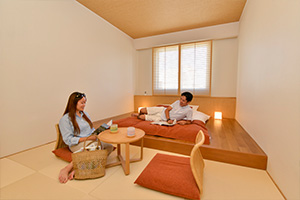 畳間と一段小上がりの床の間にベッド用マットレスをセットした和モダンタイプの客室タイプです。